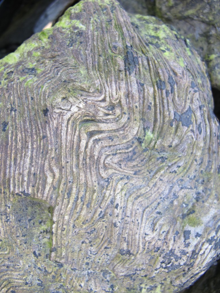 Along the shore we found this maze design on a piece of our 500-million-year-old coastal schist. The rock is metamorphic, meaning it was transformed by tremendous heat and pressure under the ground.